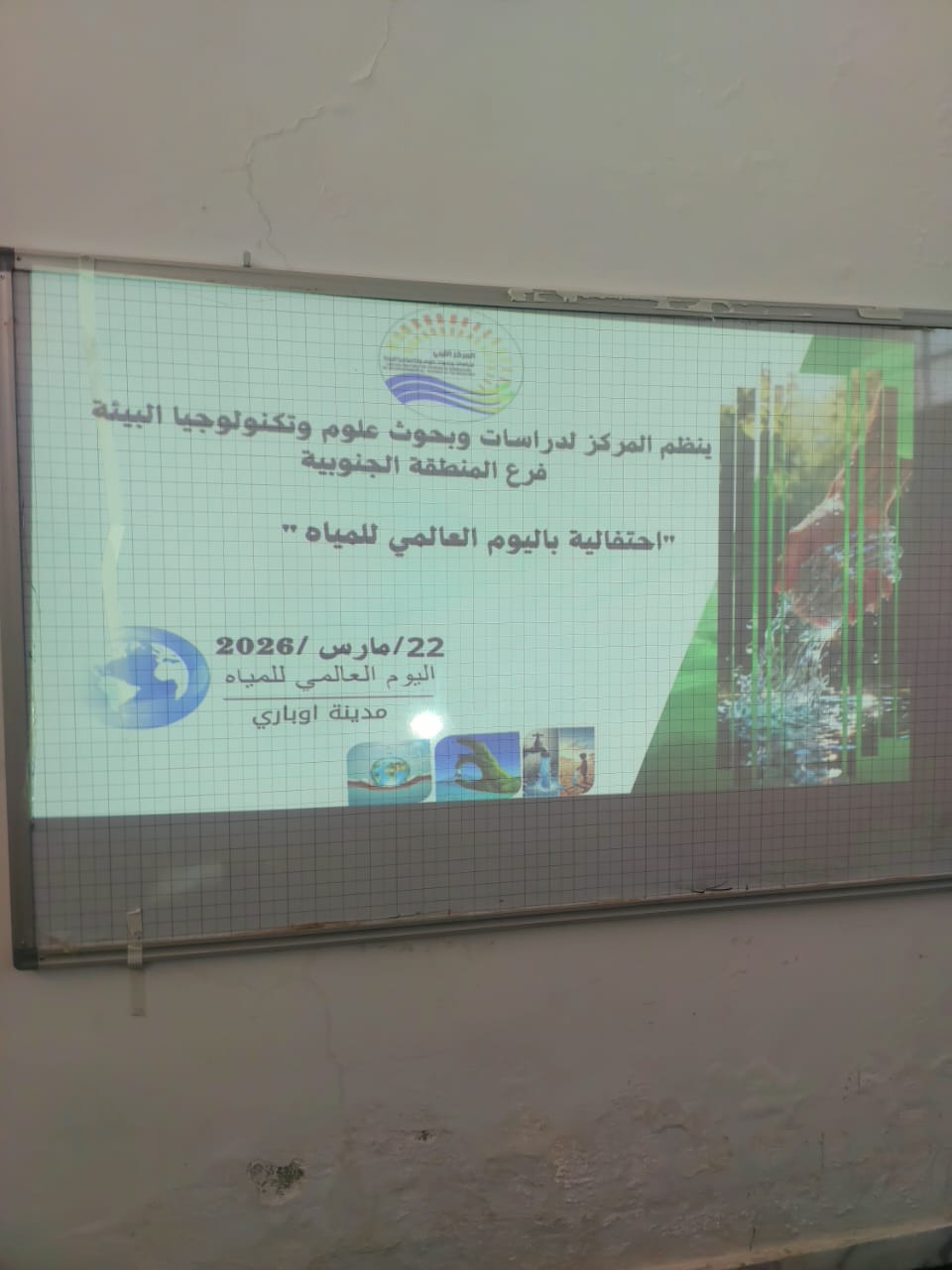 أقام فرع المركز بالمنطقة الجنوبية اوباري صباح يوم الاثنين الموافق 30.03.2026. احتفالية بمناسبة اليوم العالمي للمياه بمدينة اوباري بحضور بعض الادارات المختصه والمتمثله في الاصحاح البيئي ومركز الرقابة على الاغذية ومكتب الزراعه وبعض عمداء الكليات والمهتمين حيث القيت محاضرة حول الأمن المائي في الجنوب تخللها نقاش مستفيض من الساده الحضور المختصين والمهتمين بالمياه للوقوف على الوضع المائي والأخطار التي تواجه المنطقة في ظل شح المياه ومحدودية مصادره.